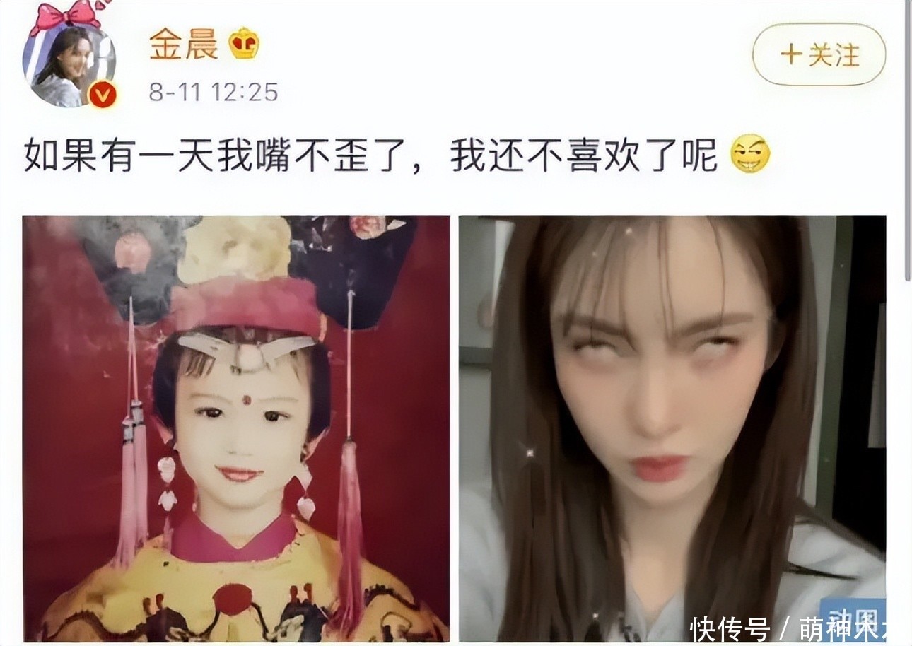 比较微妙的还有金晨的脸换个角度就是另一幅模样,看她低头视角的照片会发现五官面部轮廓偏细长型,面颊很瘦,眼角、鼻尖、下巴都很“尖”,而非肉肉的圆润感。在这种对比下,更能观察到她面部看起来奇怪的地方。做表情的时候,比较明显的是嘴部状态,能明显看到“嘴歪”,上唇与下唇彻底错位。