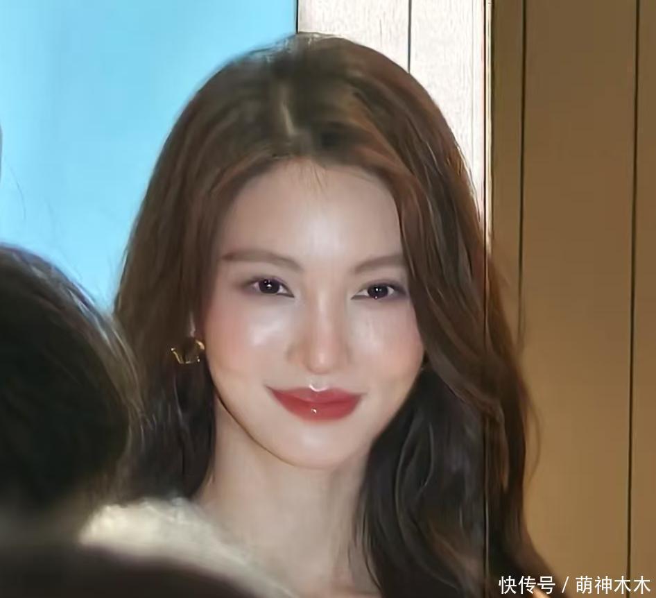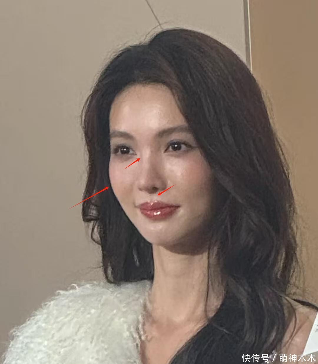 放大唇部,会发现她的唇峰鼻子并不在一条直线上,上唇偏向左边,下唇偏向右侧。可能为了唇部完整性,化妆师对口红画法做了细节设计2024年开云真人百家乐,加宽了上唇的口红,但是结果来看像是口红画出界了,唇妆花了。
