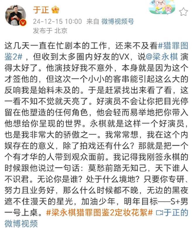 随着剧情更新,我们可以看到《猎罪图鉴2》的热度越来越高,12月15日,于正突然在自己的社交账号发出一条消息,他表示:这些天一直忙于工作,还没来得及看《猎罪图鉴2》,但很多圈内好友都给自己发消息,表示梁永棋演的太好了。
