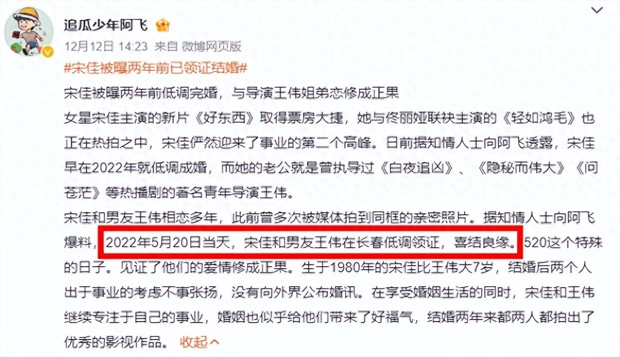 环球网:热搜第一!宋佳被曝已领证结婚即时比分世界杯,男方系青年导演王伟